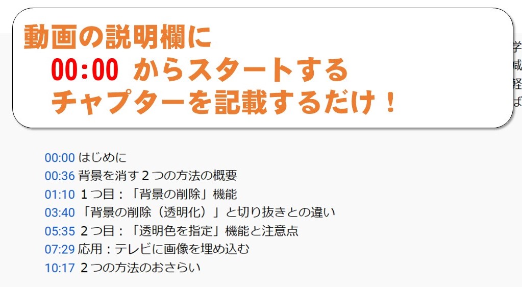 解説動画の中でも述べていますが、チャプターとは、1つの動画をいくつかに分割して、本の章のように目次を作成するような機能です。DVDなどでもチャプター機能があるので、それを思い出してもらうとわかりやすいと思います。