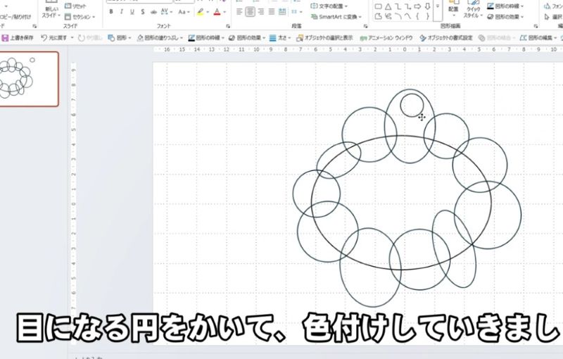 描き方の詳細などは動画を見ていただくといいと思いますが、基本は楕円の図形を大小つくって重ねていくだけでそれらしく見えてくるから不思議です。