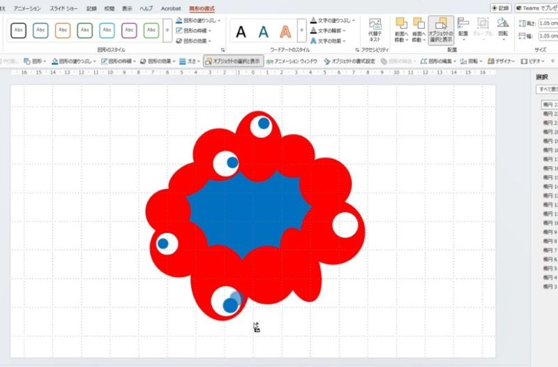 そこで、いまさらですが、PowerPointの図形機能でミャクミャクを描いてみました。